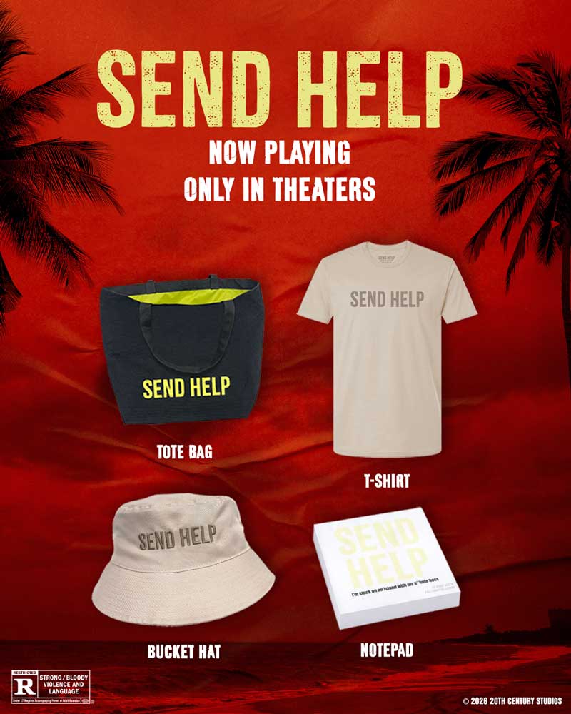 We are giving away six SEND HELP prize packs, including a tote bag, t-shirt, bucket hat and notepad!