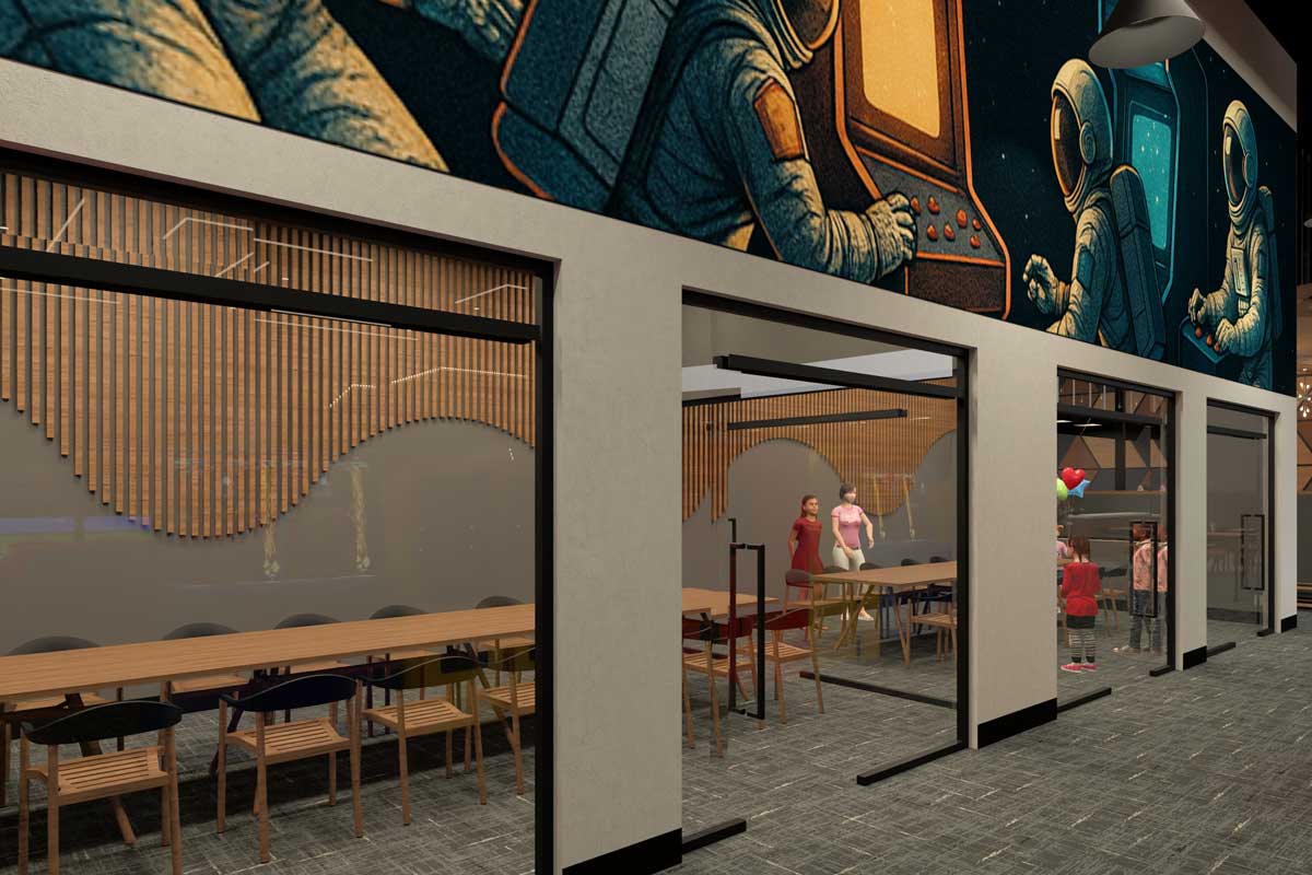 - Conversion of two existing auditoriums into a new arcade space with party rooms